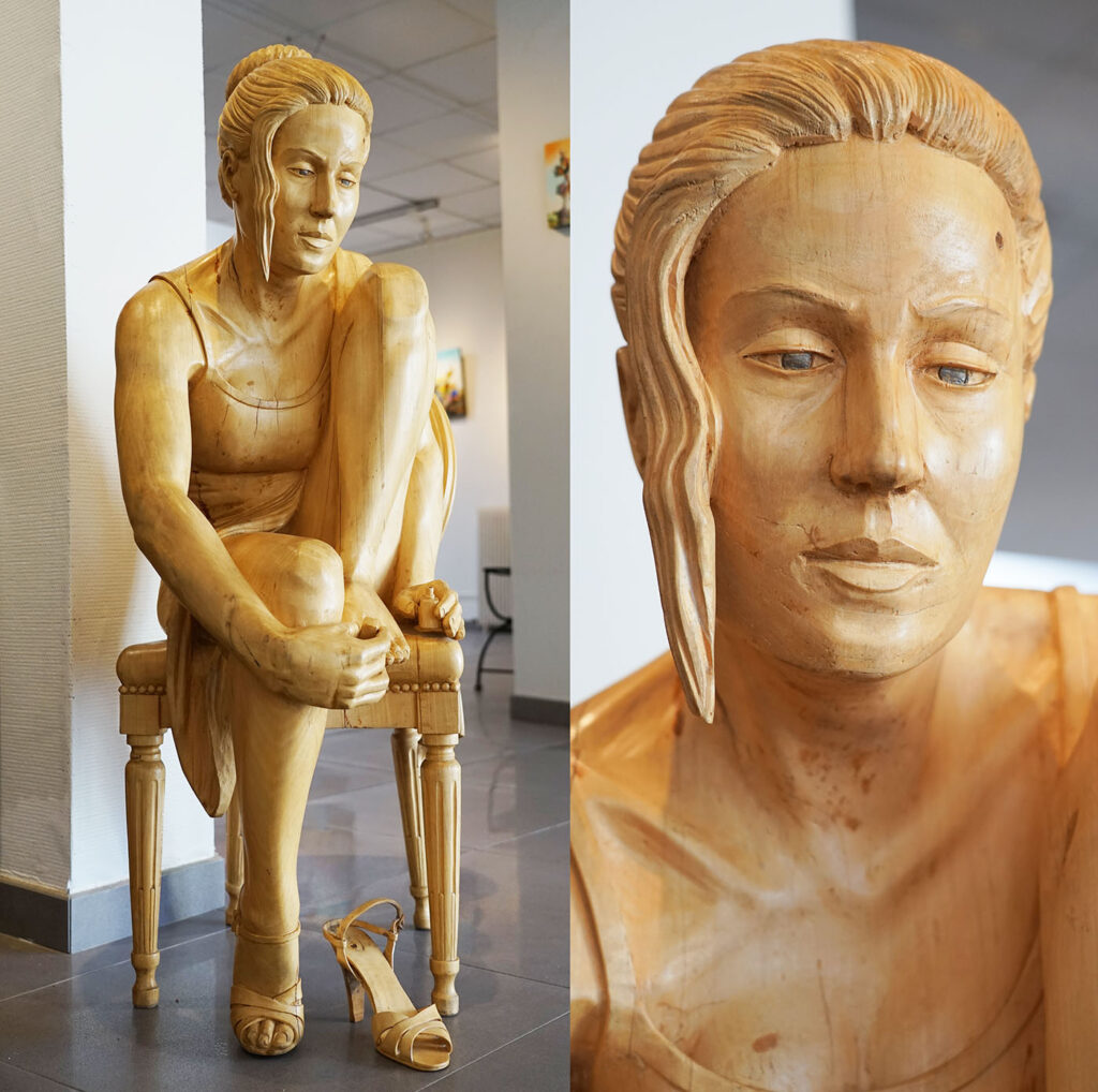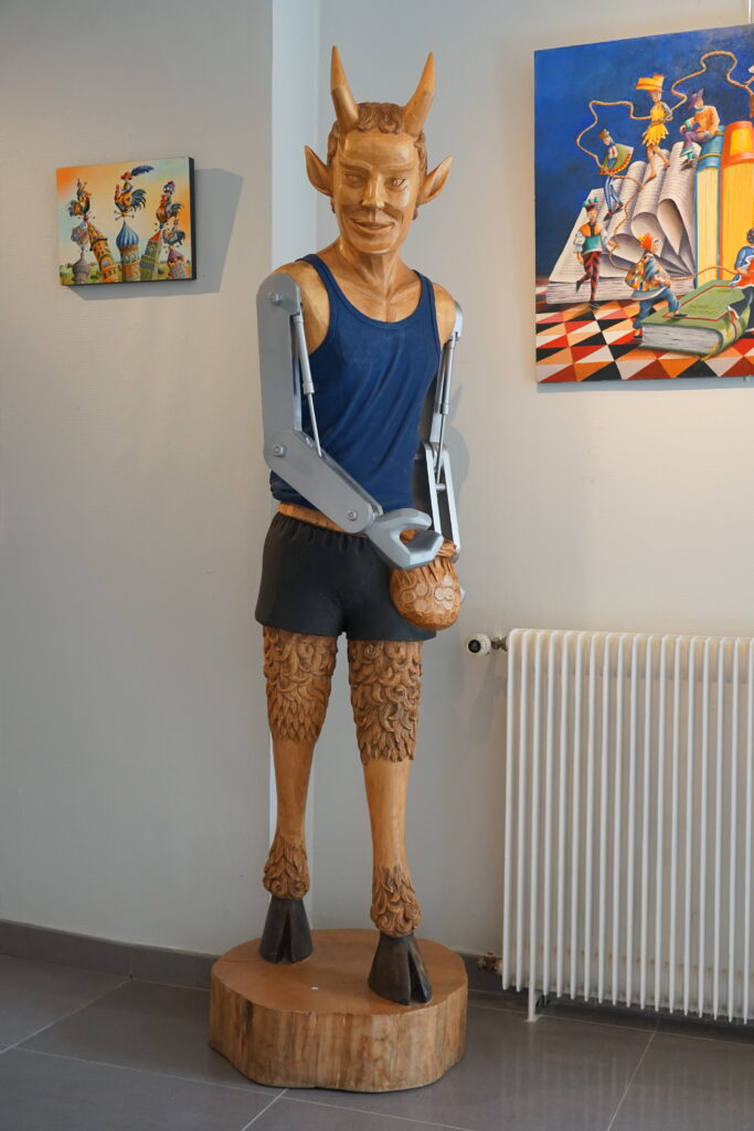 Il y a de l’humour dans cette sculpture, de la tendresse. Laisser s’exprimer le bois demande une sensibilité respectueuse. Sculpter le bois, c’est comprendre l’arbre, le sens de sa vie, sa quête de l’altitude, c’est puiser son inspiration dans la matière et en dégager l’esprit. Par exemple cet envol de douze oiseaux « qui forcément me parleront de poésie ». Au-delà de la belle apparence, Guy Lafond nous parle de notre temps. Il nous appartient de comprendre que cet art de beauté est aussi un regard sur notre monde et sur ses dangers. Ce faune robotisé à l’entrée de cette salle n’est-il pas l’expression de l’ensauvagement de l’homme soumis à une Intelligence Artificielle ? Il y a dans ces sculptures un amour de la vie, sans les beautés narcissiques de la démesure humaine. Sculpter, c’est dialoguer, instruire, et plaire.